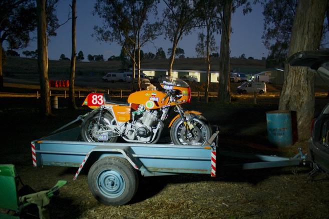 “After driving in the pouring rain for two hours we finally got to the track to set up our tent and pit area. Our little 2KVA portable generator ran all day to power the tyre warmers and charge the lithium battery on the ‘total loss’ ignition on the DAMCR Laverda. Some of the interstate teams had arrived the night before and the tent city was already bustling by the time we got there. We had a pretty good spot but heavy rain during the day nearly washed us away.”