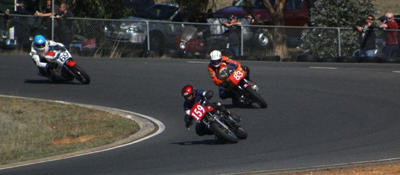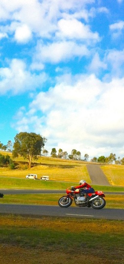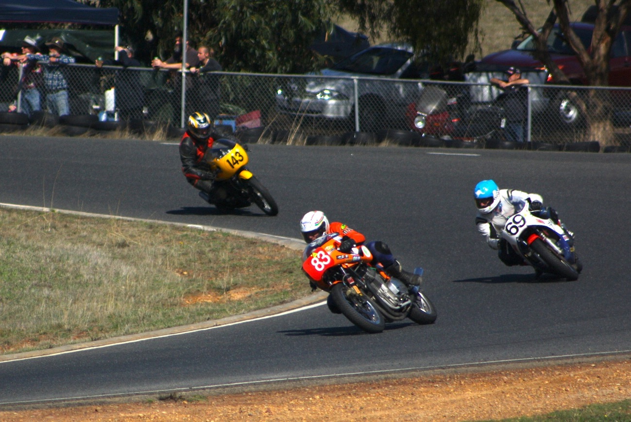 Race two was postponed to Sunday after a sidecar incident at the end of the front straight. The 1972 832cc Honda powered sidecar of Doug Flack and Lloyd Todd ran off the track hitting the tyrewall. Lloyd could be seen from the pits heaving tyres and debri off Doug who was trapped in the sidecar. The Air Ambulance helicopter arrived and landed on the hill near the accident. After some 25 minutes Doug was airlifted to Melbourne with multiple injuries although information received at the track was that no operations were necessary. He had fractured several ribs and had severe bruising.