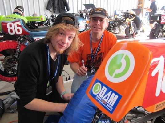 Arriving at Phillip Island Race Circuit on Thursday morning Angus and Greg were keen to set up their pit. "We were the first historics team to arrive. I was really excited," says Greg. "and to be back at Phillip Island for a race day was one thing, but to have not been on a race track for 22 years and then be here on a bike I've only cruised around on once, it made me pretty nervous. We have a 19:45 final drive ratio on the bike at the moment which is too short for this track, but I'll go out anyway in Practice and then make a decision on the ratio I think we need.
