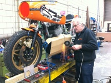 The 2011 rules for Historic Racing require any engine case that might release oil, if broken upon impact in a fall, to be protected so Ian and Greg manufactured a cover from aluminium sheet. Also required is a rear chain guard. Having limited area for decals on the SFC fairing this item became a great place for a DAM sponsor sticker.