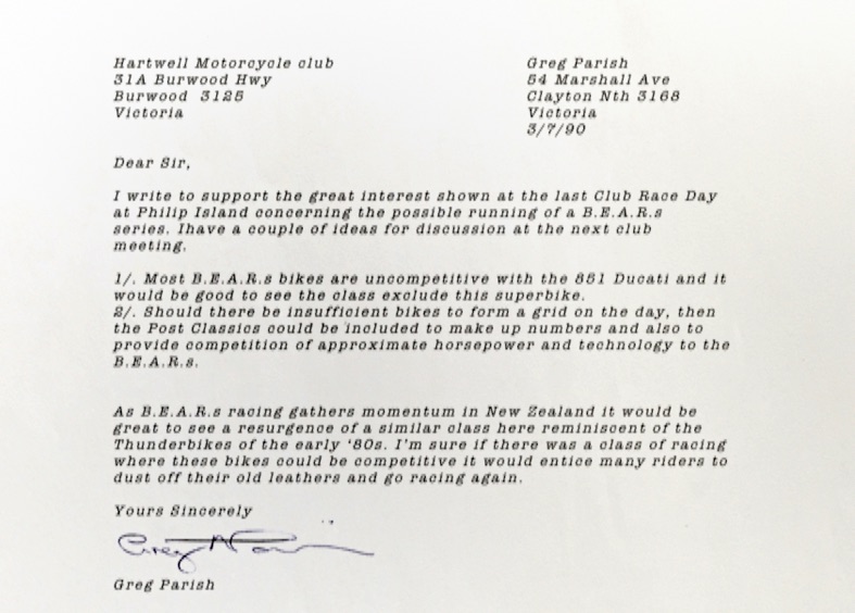 After switching from Kawasaki to race Laverda Greg Parish wrote to the racing committee to suggest running a BEARS series, asking that they specifically exclude the fuel injected 4 valve Ducati 851. The BEARS (Formula European Championship) Series went ahead, but the committee declined his suggestion and the Ducati 851 was not excluded from the competition. The ensuing battle between the Laverda and Ducati for the title was colourful, filled with great battles for 2nd and 3rd places as the Ducati 851 easily left the field far behind but failed to finish on several occasions lifting the every contender each one place.