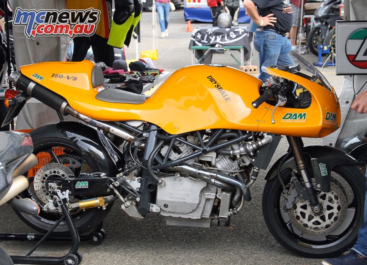 Although the ride was commandeered by another rider it was a sight and sound like no other to see these two engineering marvels on the track together. Nickles had commissioned and financed DMCo to build this extraordinary bike in the mid ‘90s. In it’s original configuration it was fueled by 8 carburettors when test ridden by Cathcart and Parish on the same day at Calder Park Raceway. The relatively heavy throttle was source of humour between the two riders because even though it was heavy by most standards it was not significant when compared to that of a Laverda Jota! The carburettors were soon replaced by fuel injection while subsequent models had a different timing chain arrangement and the capacity enlarged to 1000cc. The 750V8 is, still to this day, the property of the Nickles’ Estate and remains For Sale to the discerning buyer.